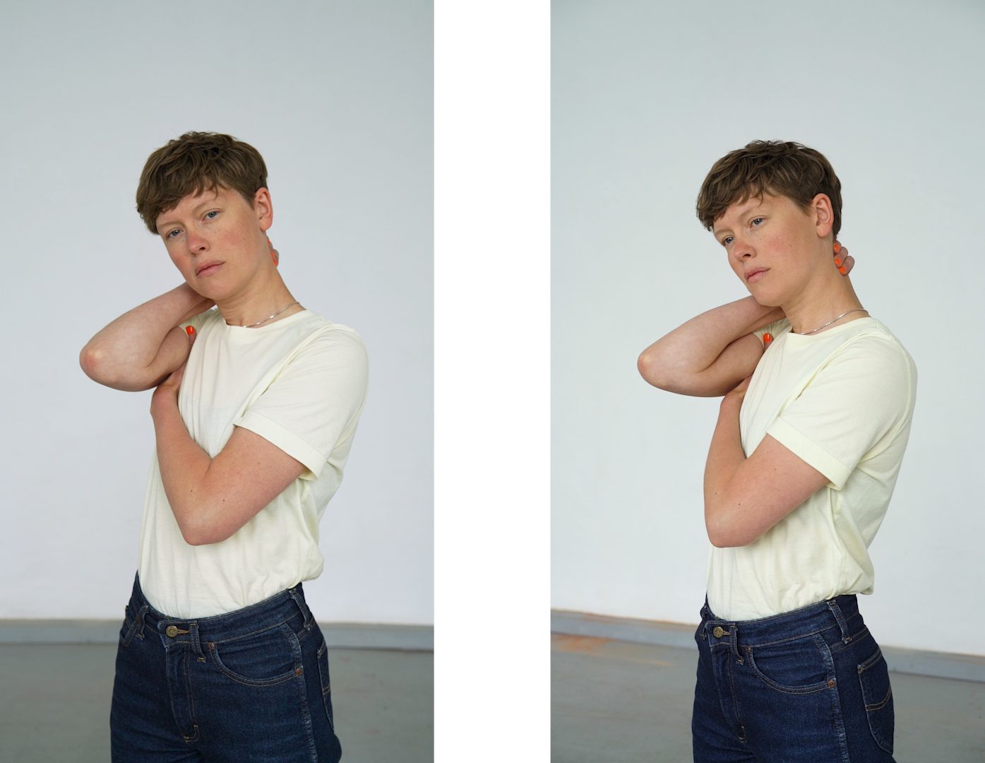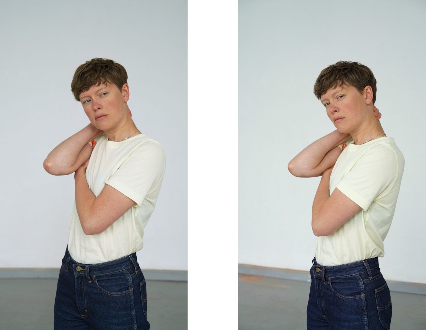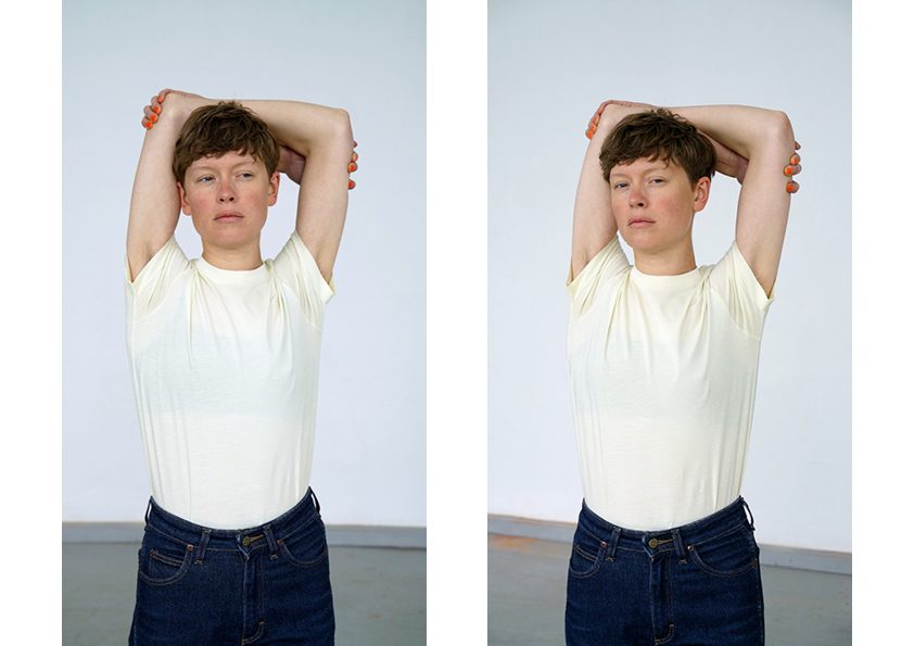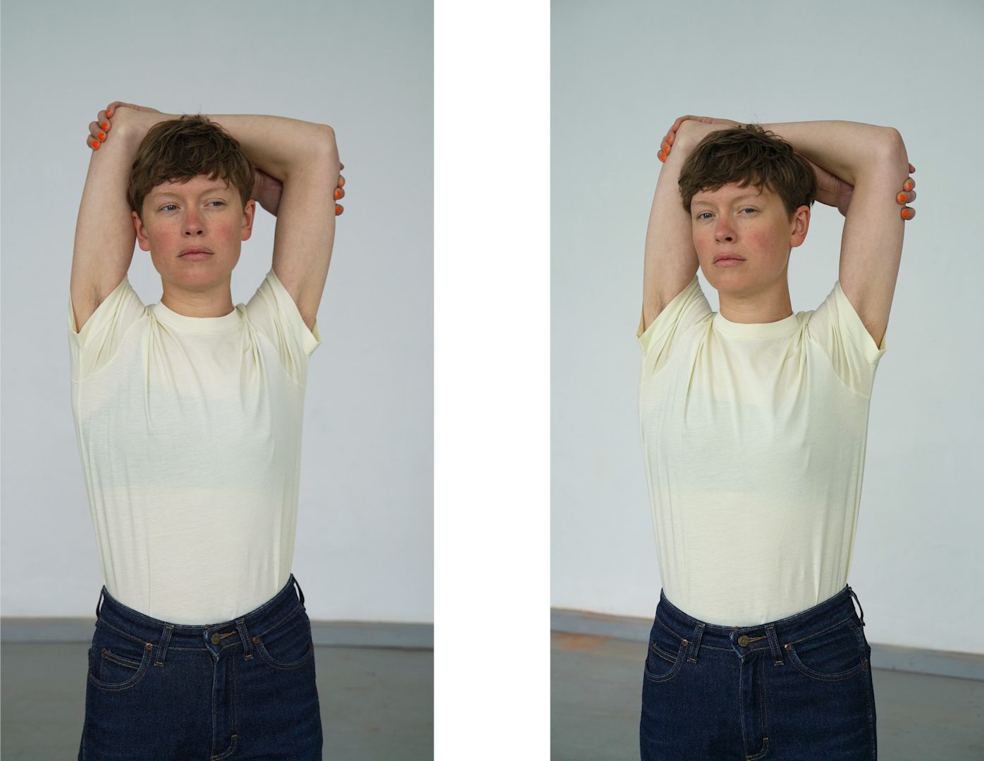 Astrid (Doppel), 2022 2-Kanal-Video, zwei 55 Zoll Monitore, 6:53 min, Loop, ohne Sound Astrid (Betrachtung), 2024 Das 2-Kanal-Video-Porträt »Astrid (Doppel)« bewegt sich an der Schnittstelle von Fotografie und Bewegtbild und stellt den Blick und insbesondere die Pose in den Fokus. Die Pose ist wie eine »vor-fotografische Fotografie« (Kaja Silverman): Das Subjekt versucht mit der Pose Handlungsmacht über den Prozess des Zum-Bild-Werdens zu erlangen, indem es versucht, das Bild vorwegzunehmen. In »Astrid (Betrachtung)« begegnen wir in fünf Bildern Astrids Blick in Nahaufnahme. »Im Porträt entwirft, entzieht und entscheidet sich vor unseren Augen ganz sichtbar unsere Möglichkeit, präsent zu sein.« (Jean-Luc Nancy: »Das andere Porträt«)
