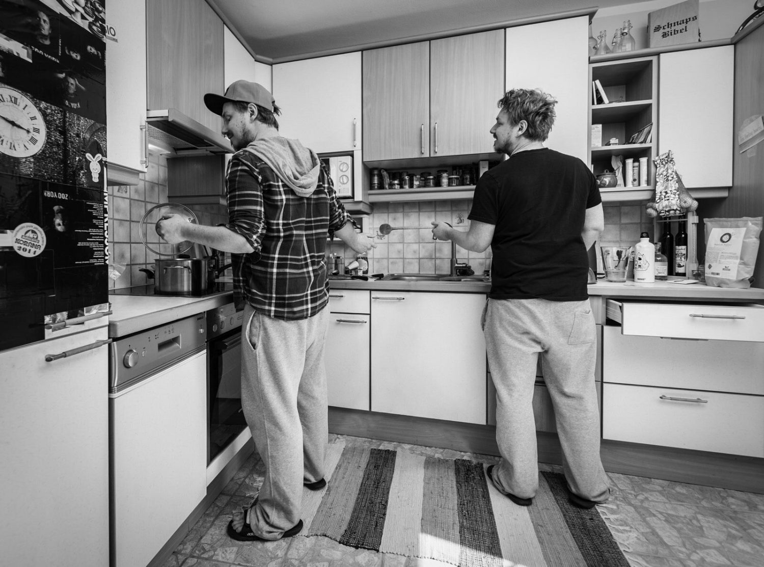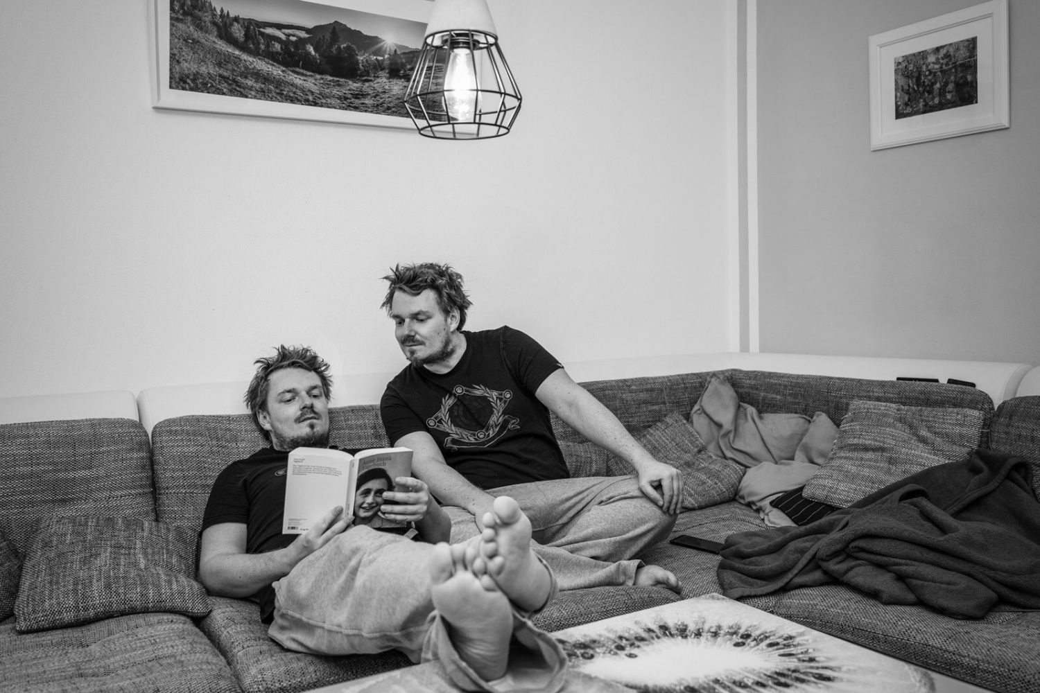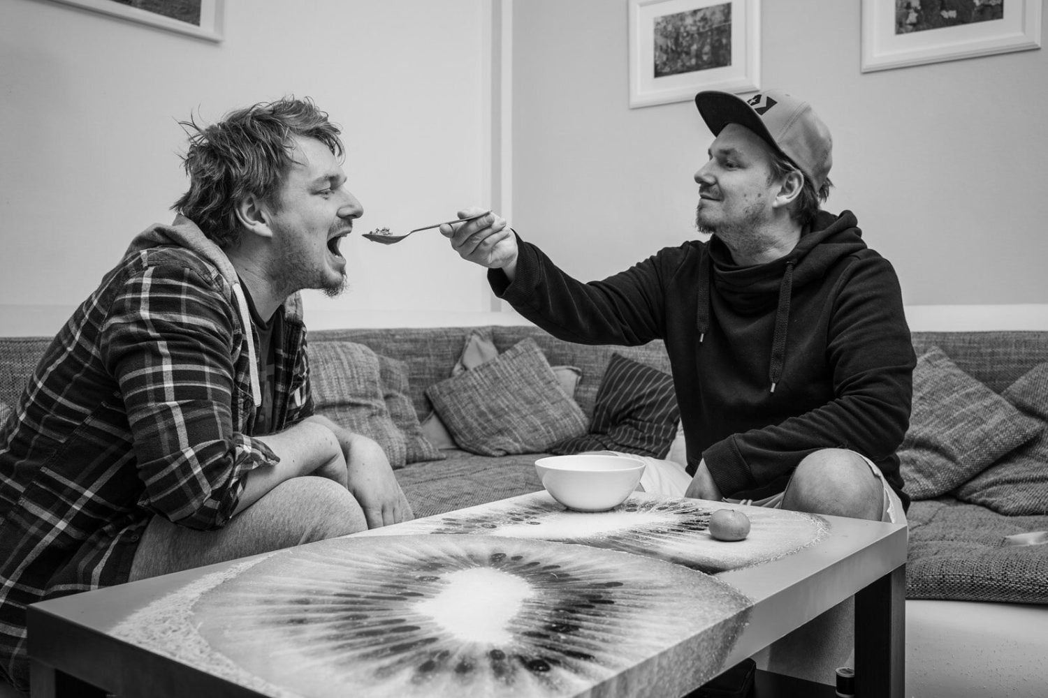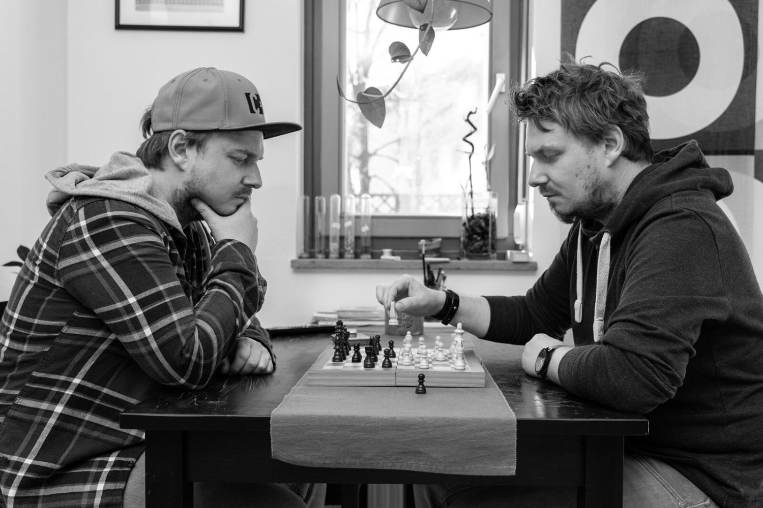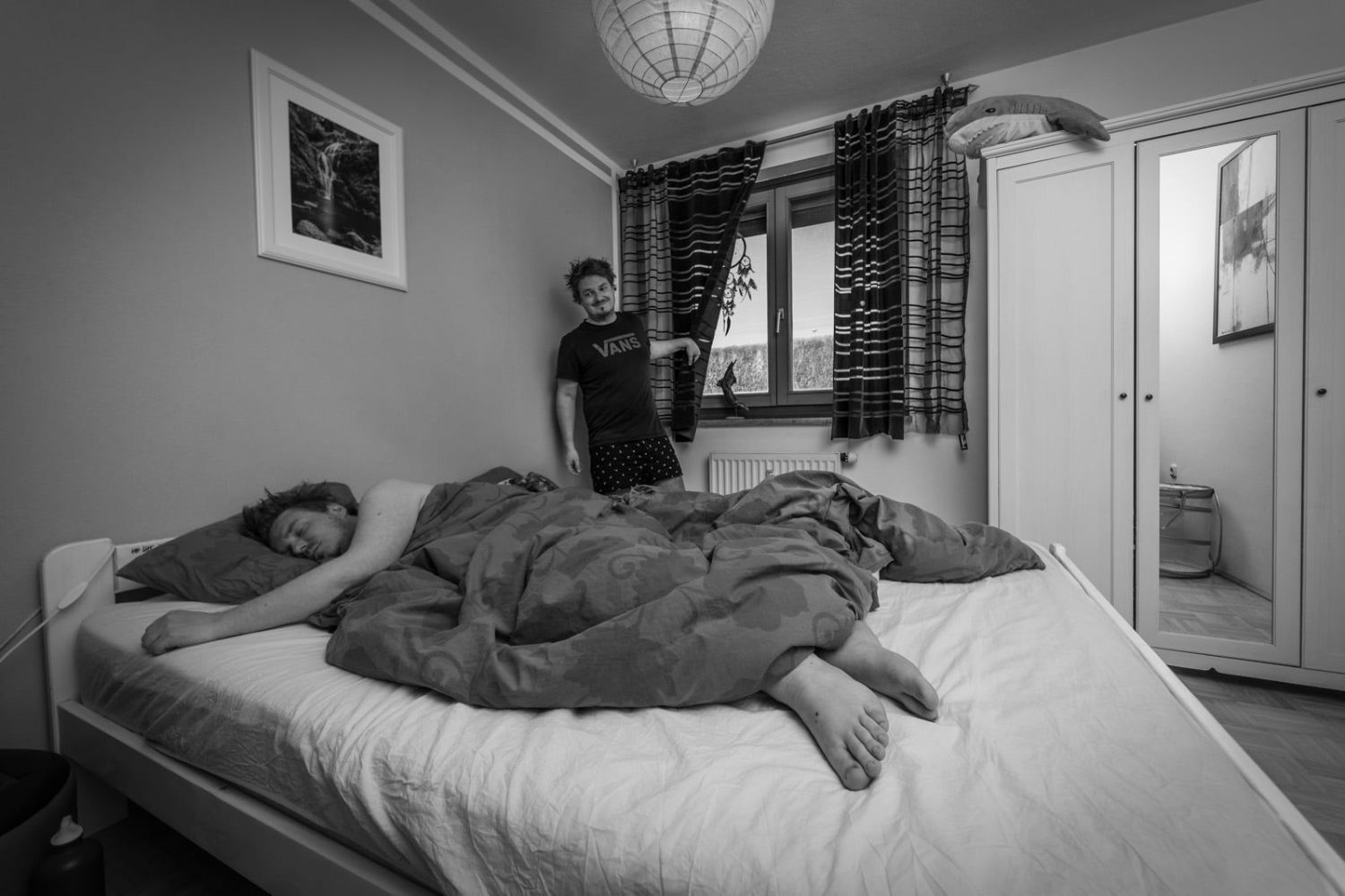 Lockdown – Zuhause bleiben, nur einkaufen und Bewegung in der Natur ist erlaubt. Keine sozialen Kontakte mehr, keine Freunde treffen, keine Umarmungen, kein Körperkontakt. Ich wohne alleine, was mache ich jetzt den ganzen Tag? Also stellt sich die Frage, wie kann ich mich mit mir selbst beschäftigen, ohne den ganzen Tag in den Fernseher zu glotzen oder zu schlafen. Erstes Ziel, überleben. Aber einfach nur überleben, Klopapier kaufen und Nachrichten schauen? Nein das geht auch nicht. Ich hab nur mich selbst, ich, der wichtigste Mensch in meinem Leben. Vielleicht sollte ich mich mit mir selbst beschäftigen, mich erforschen, mein Innerstes finden, mein Ich erkunden? In dieser Fotoserie habe ich meine Begegnungen mit mir selbst humorvoll aber auch in ihrer Schwere und Bedeutsamkeit fotografisch festgehalten, denn diese Beziehung, die jeder mit sich führt, hat ihre Höhen und Tiefen. Sie lässt uns oft lächeln, manchmal weinen, vielleicht auch an Grenzen kommen, sie stellt uns aber immer die Frage: Wer bin Ich? Die Serie begann im Lockdown mit dem Foto »Schach« und dem Text »Isolation part1 - Uns gehts gut, ich habe gewonnen.« das ich auf Facebook stellte. So hat auch jedes Foto einen kurzen Text, im Fotobuch, das ich Euch als PDF schicken wollte kommt die Idee etwas besser zur Geltung.
