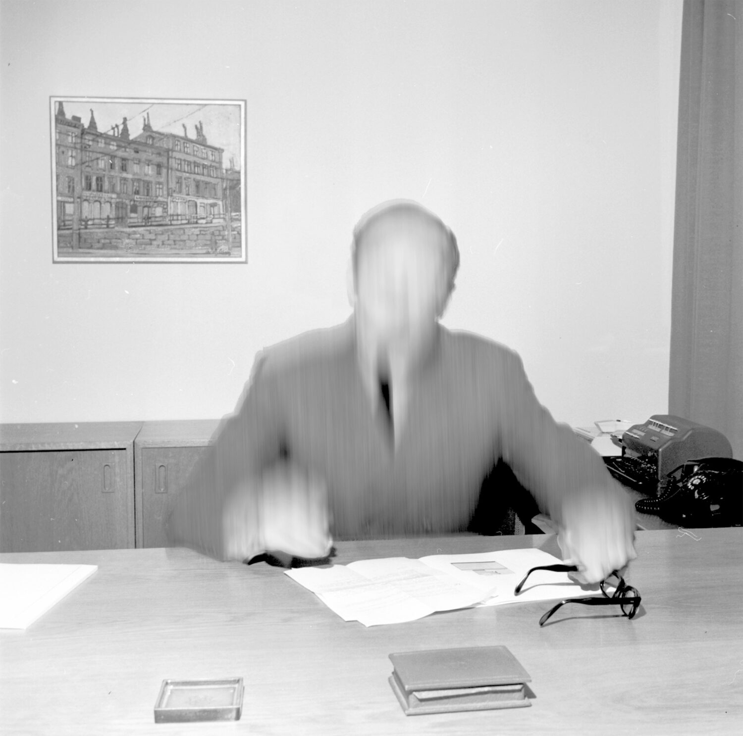 The Unmovable Mover ist eine visuelle Untersuchung der Machtdynamik innerhalb der - sozialen und physischen - Infrastruktur der Fabrik. Das Projekt versucht, visuelle Referenzen, die direkt aus der Archäologie und Museografie übernommen wurden, sowie sich überschneidende Reflexionen über das Bild als Dokument, als Wahrheit und als Fiktion zu kombinieren. Der ästhetische und konzeptionelle Ausgangspunkt der Arbeit war der Fund einer Fotografie in einem Schweizer Antiquariat (1), die später überarbeitet und verändert wurde. Wir schreiben das Jahr 1972, und am Schreibtisch eines sehr bescheidenen Büros sitzt ein nicht identifizierter Direktor einer lokalen Fabrik für Ersatzteile und Spezialmaschinen, die heute nicht mehr existiert. Das Projekt versucht, die private Vergangenheit dieser kleinen Realität auszugraben und eine hypothetische hierarchische Struktur zu rekonstruieren, indem es offen inszenierte Fotos aus dem Jahr 2022 zeigt. Eine solche Operation garantiert nicht nur die Universalisierung des Kontextes und der gleichen Infrastruktur durch verschiedene Räume und Zeiten, sondern auch die Überhöhung der Arbeit der spezialisierten Produktion, die der Gegenwart, deren Produkte zu glitzernden Ausstellungsobjekten werden, die mit fast skulpturalen Qualitäten ausgestattet sind. Auf der anderen Seite erscheinen die Wiederherstellung und visuelle Neuerfindung der Figuren, die diese Produktionszentren und ihre Büros leiten, als Geisterbilder.